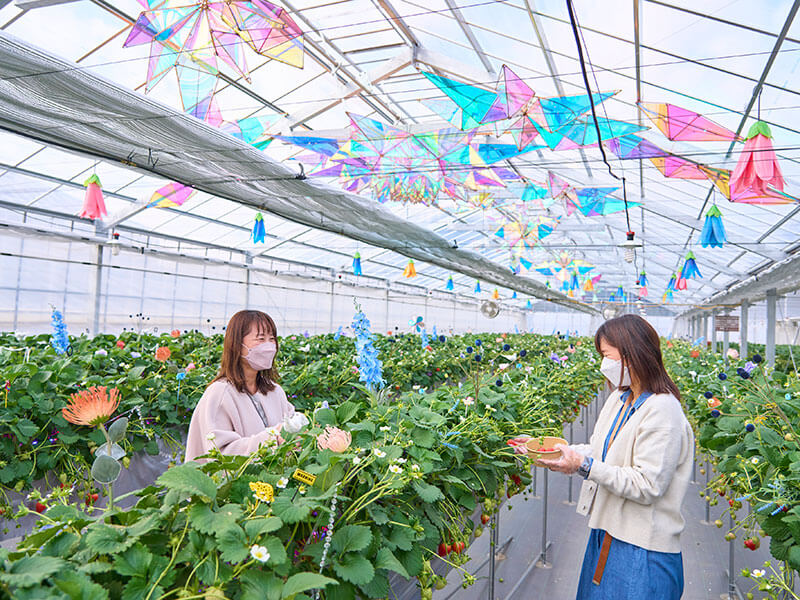 また、温室にはあかりアートで有名な「日本あかり博」とアート集団「ミラーボーラー」がコラボレーションしたアート作品が展示されており、幻想的な雰囲気の中でイチゴ狩りを楽しめる。SNS映えする写真をたくさん撮れると好評だ。