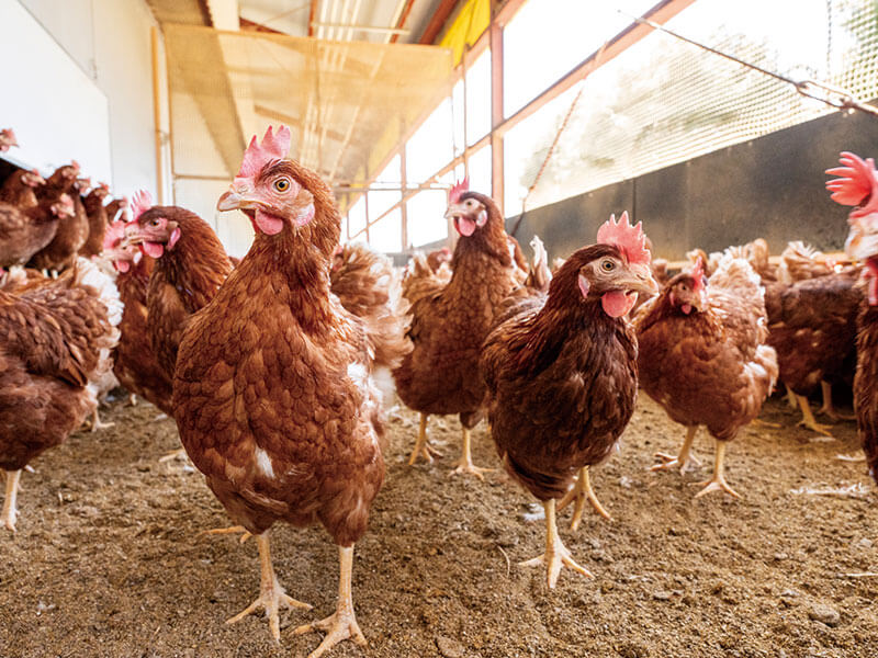 高級赤卵で知られる「純国産鶏もみじ」を飼養。鶏たちは、鶏舎と半屋外の遊び場を自由に行き来し、日中を過ごす。