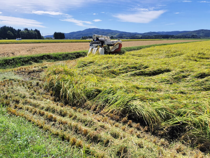 記者が取材に出かけた9月16日は、稲刈りを初めて3日目。あきたこまちの稲を刈り取っていた。10年以上前に整備をして、1区画1ヘクタールに大規模化した田んぼである。「7月下旬から良い天気が続いて、今年は豊作を期待していたが、8月中旬以降の雨で実った稲が一気に倒れてしまった」と残念そうに下を向く。稲が倒れるのは収穫量が多い証拠だが、刈り入れが遅れると品質の劣化が心配されるという。