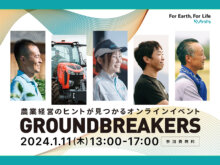 毎年話題のオンラインイベント「GROUNDBREAKERS」が1/11に開催! 農業の課題解決に取り組む先駆者の事例や様々なテーマに関する座談会、クボタのソリューション紹介など人気のコンテンツに加え、今年は施設園芸農家必見の内容も予定されている。