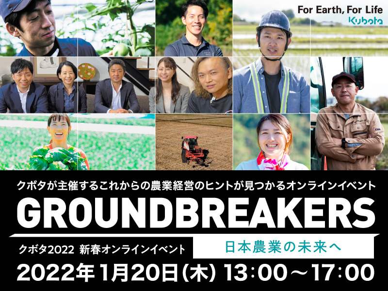 農業ソリューション事業を手掛けるクボタが2022年1月にオンラインイベント『GROUNDBREAKERSー日本農業の未来へー』を開催する。