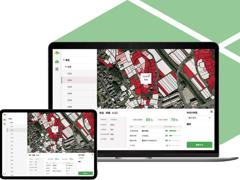 今回同社がサービスを展開する“デタバ”は、衛生データとAI(機械学習)を用いて、独自の技術で農作物の種類を見える化するアプリケーションサービスである。主に各市町村の経営所得安定対策用として地域農業再生協議会にて活用することができる。全ての圃場の作付け状況が分かるだけでなく、作付け判定の記録・データ管理までアプリで完結するため、簡単に効率よく作付け調査を行うことが可能になるという。