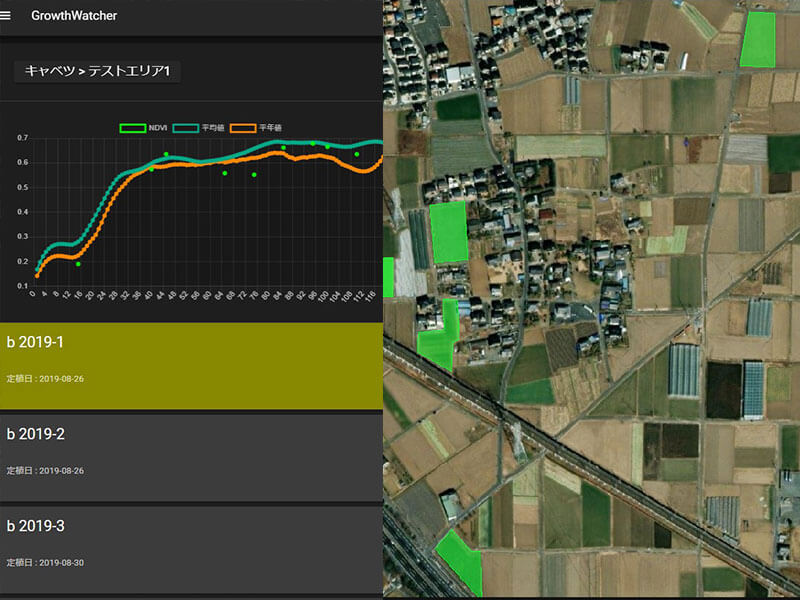 「GrowthWatcher」は衛星データを活用しているため、労力をかけることなく、2~3日に一度、畑の状況を確認することが可能である。(対象地域、気象条件により異なる。)状況把握は、地域、作物、栽培時期など、それぞれで実施するため、現実に即した判断を行う。また、畑ごとだけでなく、エリアとしての状況把握も可能にしているため、集出荷、購買に関わる業務の効率化にも役立てることができる。