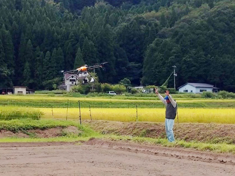 ドローンで種を撒く。使用した機体は、飛助 MG/DX 10L 農業用農薬散布ドローン。1反の畑で30分かからず作業完了。