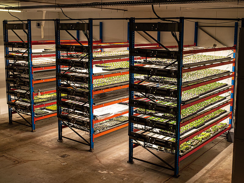 この地下農場では、垂直農法により省スペースで、光や温度、湿度などを最適に制御しながら、パクチーやルッコラなどの葉野菜を月2万本生産。また、食品スーパーや地元のビール醸造所と連携し、販売期限切れのパンやビールの搾りかすなどでできた菌床でシイタケやエリンギなど、月約6tのキノコも栽培している。これらの農産物はベルギー国内のオーガニックスーパーやレストランに供給されている。