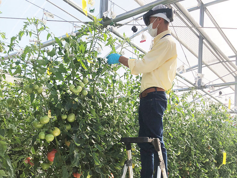 成果のなかで注目したのがローカル5Gとスマートグラス、それにスマートグラスAR技術とを組み合わせた遠隔農作業支援である。「NTTe-City Labo」に建てられたハウスでは、実際に農業未経験の60歳代の方が主担当者となり、パートタイマーの補助作業者2名とともにトマトを栽培していた。