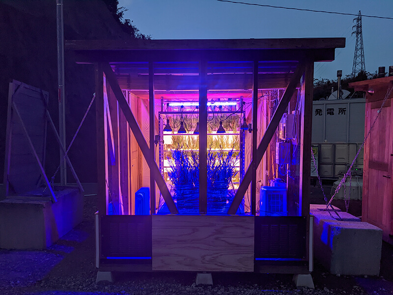オムニア・コンチェルトの環境統合制御機器『コンチェルト:OECS-1000』と遠隔監視制御システム『Sfumato』を活用して、温度、湿度、CO2濃度、照度を見ながら統合環境制御を行いました。木製ハウスには、天面と側面に弊社が独自開発した太陽光パネル付きブラインド、換気用ファン、サーモグラフィカメラなどが装備されており、また、照度センサーを配置しており、夕方から夜間になるとLEDを点灯させました。回収したCO2は最適なタイミング・濃度で局所施用しました。もちろん潅水、排ガス浄化も遠隔自動制御です。浄化の状況や、CO検出においては、アラートやパトライト機能により危険管理も徹底しております」(藤原さん)。