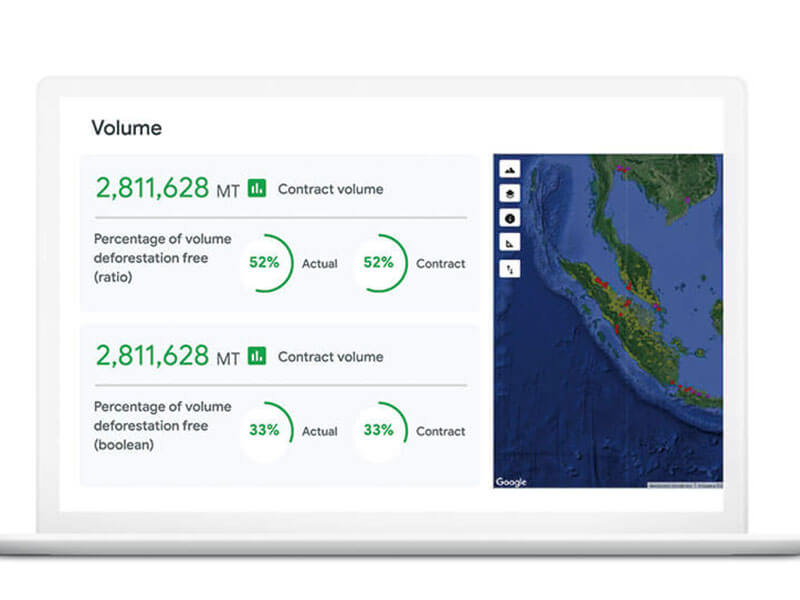 「トレースマーク」は、サプライチェーンのトレーサビリティや透明性を高め、サステナブルな原材料調達をサポートするモニタリングプラットフォームだ。グーグルのクラウドコンピューティングサービス「グーグルクラウド」の地理空間技術をベースに構築。パーム油やコーヒー、ココア、綿などのコモディティ作物(※)を対象に、衛星画像と様々なデータを組み合わせて分析し、森林破壊や生物多様性など、サプライヤーの生産活動による環境影響を可視化する。