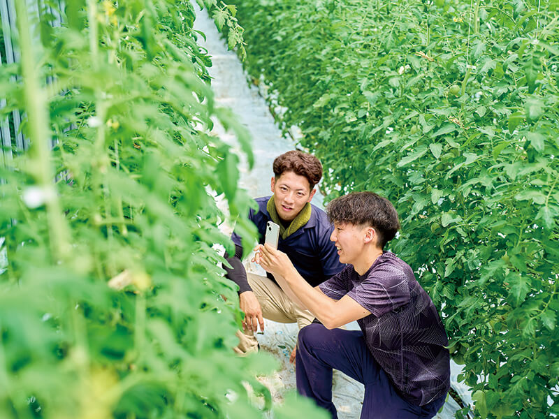 (写真左)篠原貴大さん。農業大学校を卒業した後、海外研修などを経て親元就農。父親とともに経営する「とまとのしのはら」のトマトは、2018 年に農林水産大臣賞などを受賞。令和2年度に栃木県4Hクラブの会長を務めた。