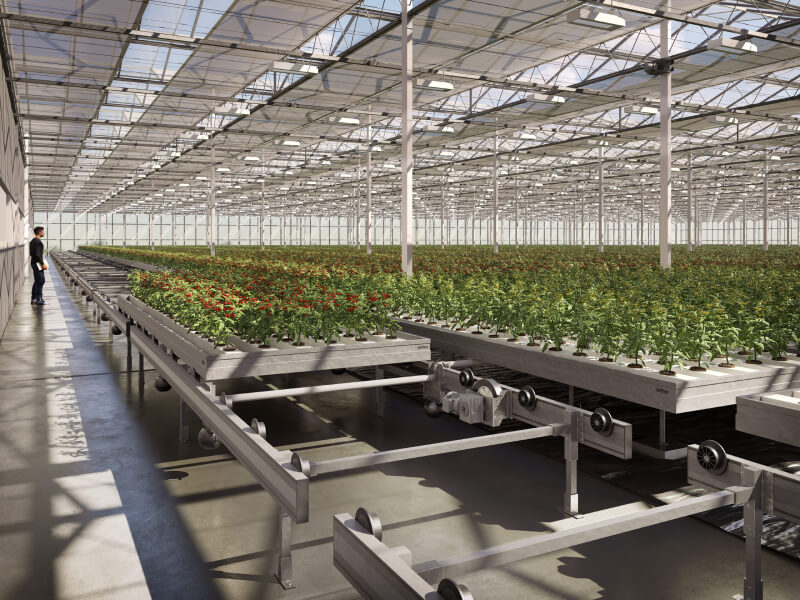 「弊社は、このシステムに適した品種を何年もかけて開発してきました。播種から約15週間で収穫できるまでに成長しますが、最大の特長は草丈が40cm程度にしか成長しない、という点です。また、ライフサイクル全体を通じて栽培ベッド上で移動可能です。姿形も一般的なミニトマトとは異なり、ハイワイヤー栽培の誘引や吊下しも不要。そのため、ミニトマト栽培に必要な多くの作業を自動化でき、時間と労働力、栽培コストの削減が可能です」