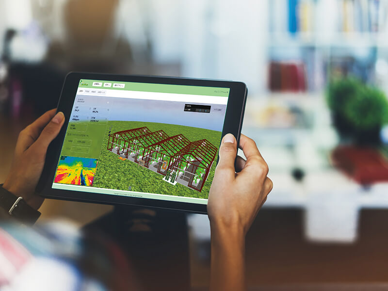 3Dを駆使した画面では、数値だけでなく、直感的にハウスの状態をリアルタイムで把握可能。また、3 D画面によるシミュレーション機能にも優れ、新設ハウスのレイアウトや設備も自在に設計・検討することができる。思い切ってスマート農業化に踏み切った新規ユーザーたちからも高評価だという。