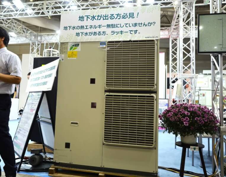 地中熱は再生可能エネルギー熱の1つだ。環境庁によると、深さ10m程度の地中温度(地温)は年間を通じて一定であり、夏は気温より低く、冬は気温より高い、という特徴がある。この地中熱の特徴を賢く使う冷暖房装置が、兼弥産業が展示していた「ナチュラルエコ371」だ。